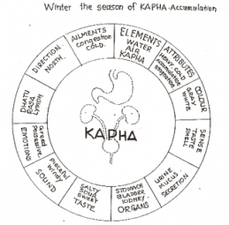There are 20 kinds of possible disturbance due to the kapha aggravation. High kapha is indicated by heaviness in body, loss of appetite, excessive perspiration, cooling of body. Physical symptoms nausea, heaviness in stomach, indigestion. Psychological symptoms are drowsiness, excessive sleep, lethargy, lack of concentration, depression, etc. Ailments such as mucus secretion,congetion,couphing, sweet test of mouth ,diabetes, joint swelling, obesity etc are some of the disturbance caused when the equilibrium of kapha dosa is disturbed.