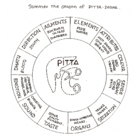 There are 40 kinds of possible disturbance due to pitta aggravation. High pitta is indicated by a desire for cool foods, cool environment and cool clothing. Physical symptoms are excessive hunger and thirst, burning sensations, hyper sensibility, and fever psychological symptoms are anger, tension, and loss of sleep, short temper etc. Ailments such as Heart burning, burning sensation in skin, bad smelling in body, more perspiration, swelling, infection redness etc are some of the disturbance caused when the equilibrium of pitta dosa is disturbed