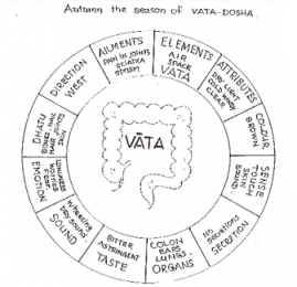 There are 80 kinds of possible disturbance due to vata aggravations. High vata is indicated by a desire for warm food warm environment and warm clothing. Physical symptoms are constipation, lack of energy, loss of sleep, fatigue, and abdominal distention with flatulence. Psychological symptoms are fear, anxiety, confusion, and aimless talking. Ailments such as body pain, stiffness, shivering etc are some of the disturbance caused when the equilibrium of vata dosa is disturbed