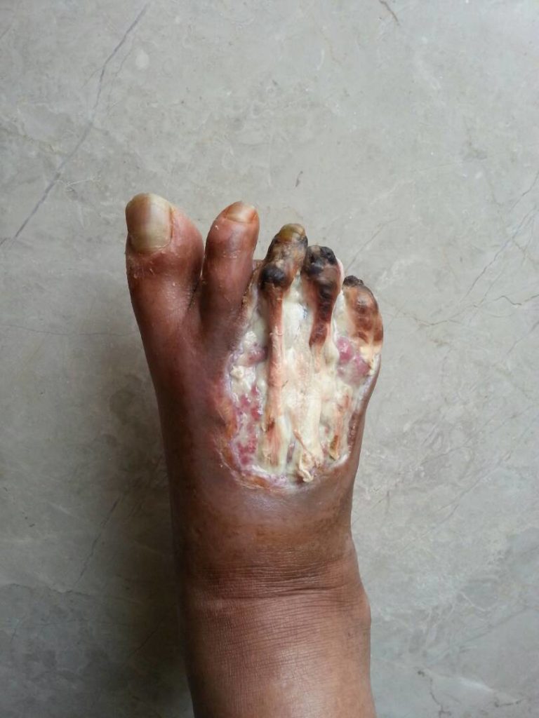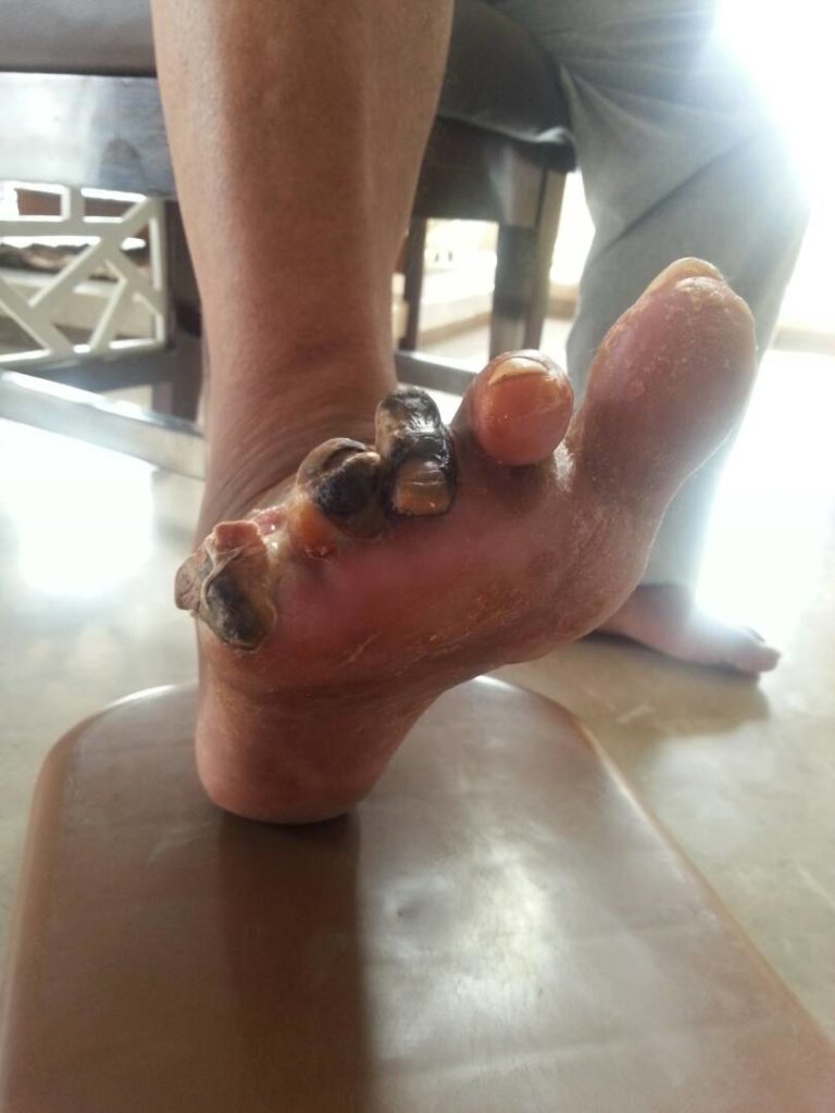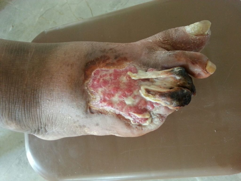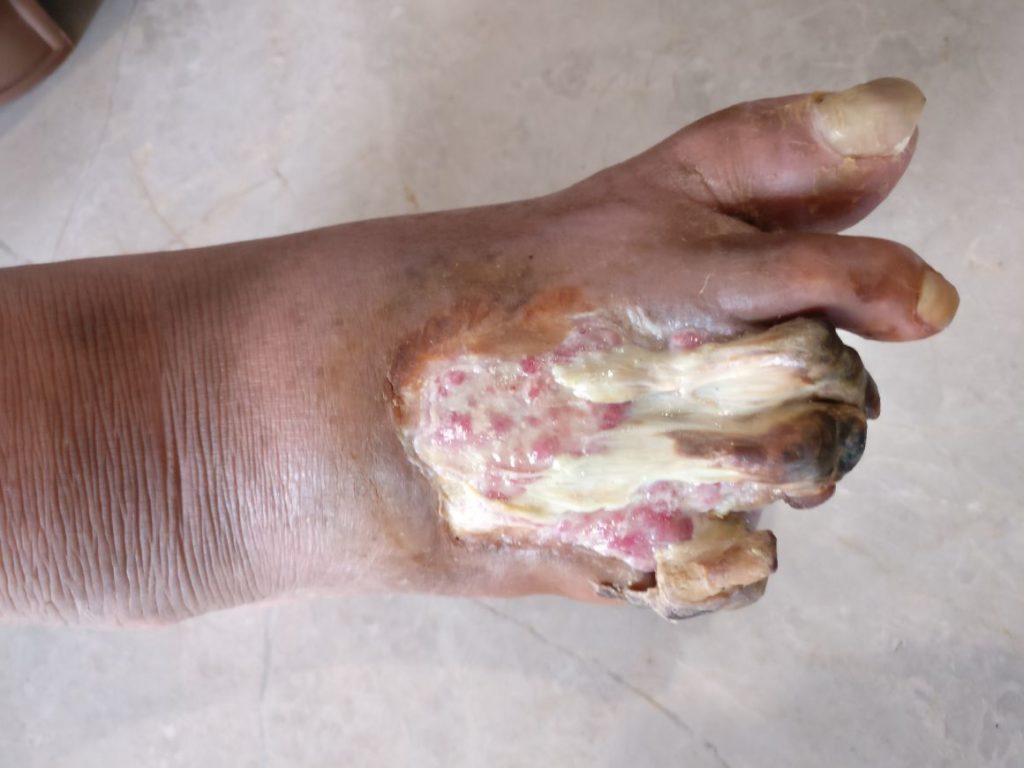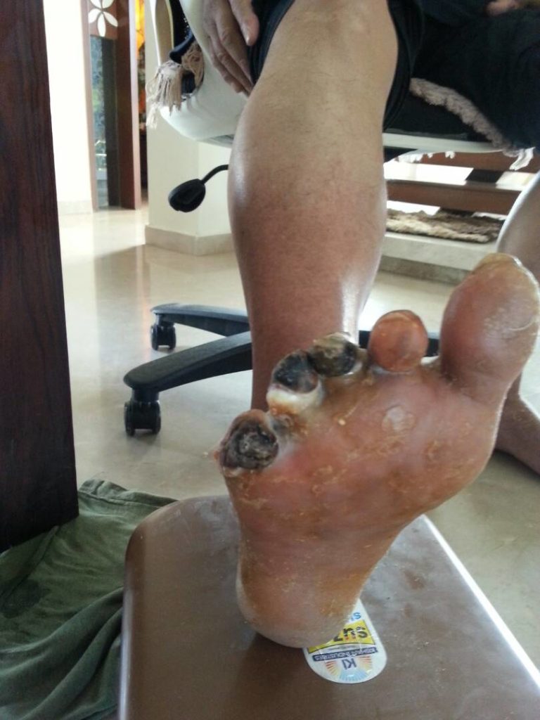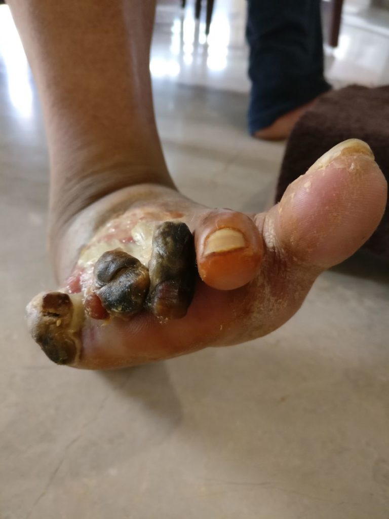My father is suffering from diabetic foot ulcer and partial gangrene since last two months. It started from his little finger on the leg which had problem of corn.