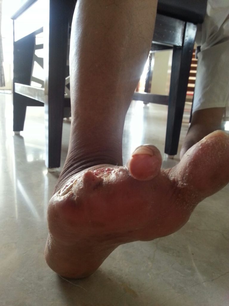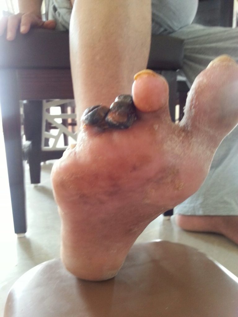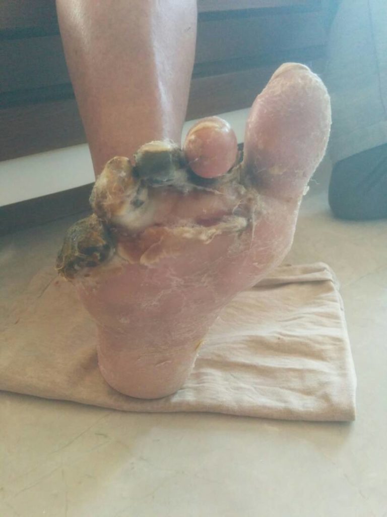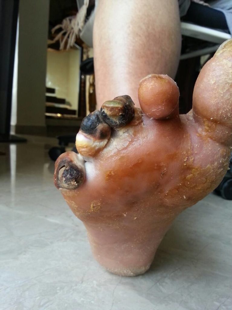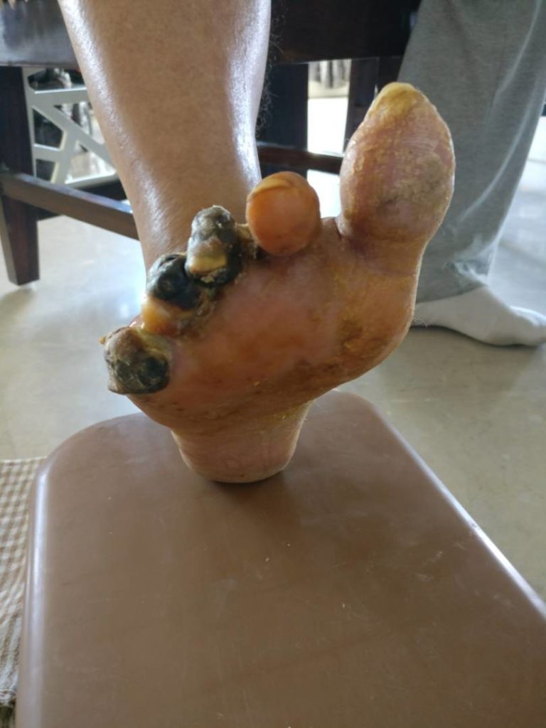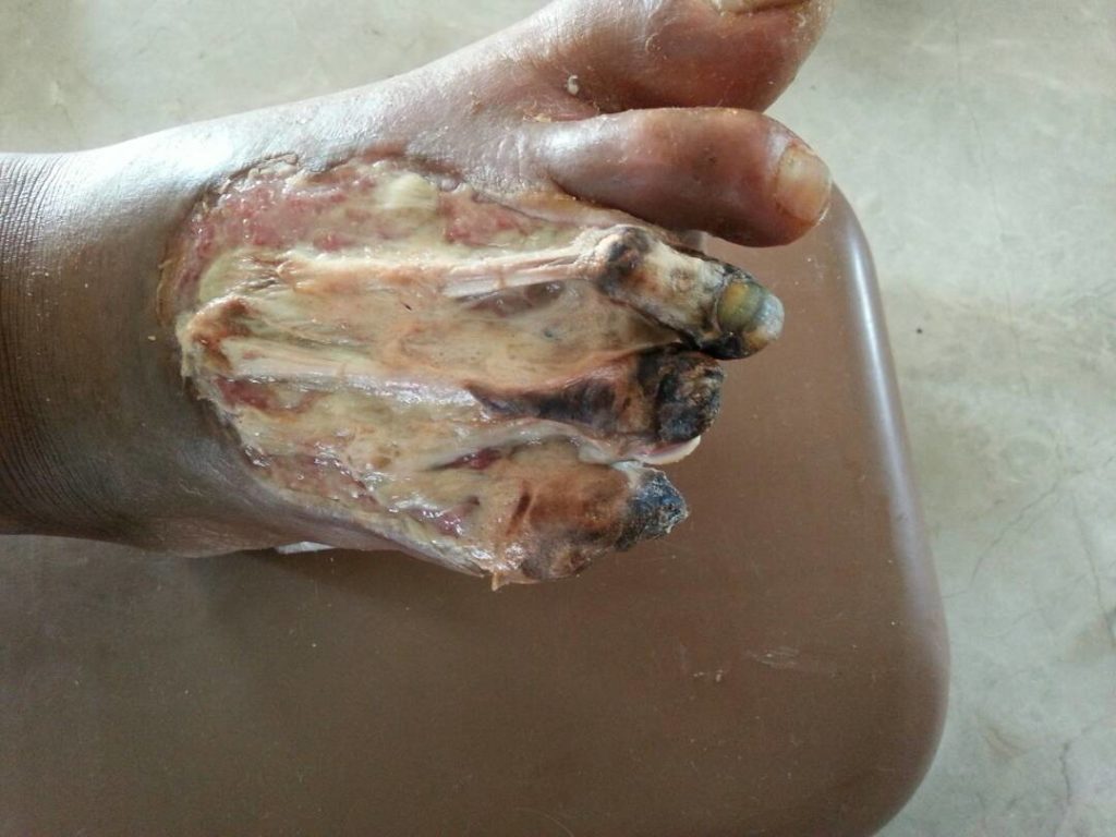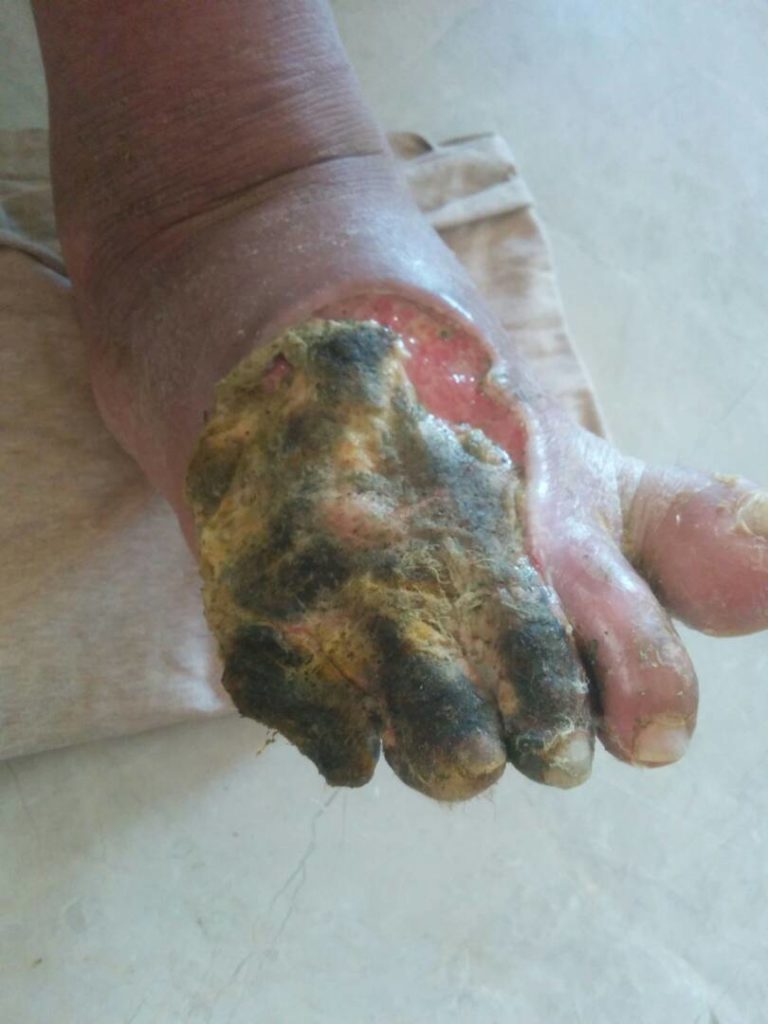 My father is suffering from diabetic foot ulcer and partial gangrene since last two months. It started from his little finger on the leg which had problem of corn.